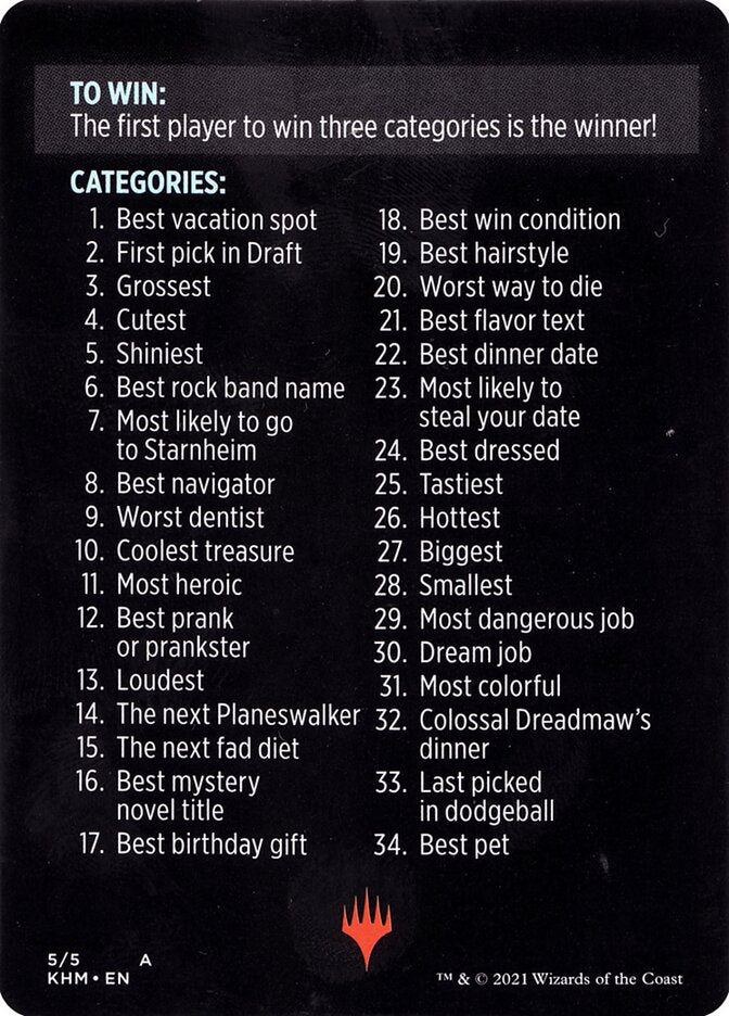 The Judge chooses a category from the list on the back of this card (either their favorite or at random). The other players each secretly submit a card from their pack that they think fits the category.