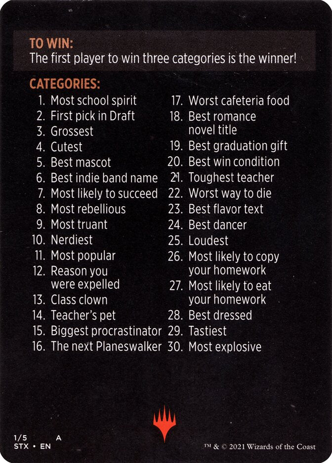 The Judge chooses a category from the list on the back of this card (either their favorite or at random). The other players each secretly submit a card from their pack that they think fits the category.