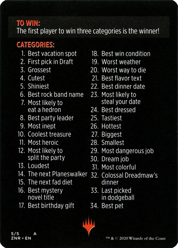 The Judge chooses a category from the list on the back of this card (either their favorite or at random). The other players each secretly submit a card from their pack that they think fits the category.